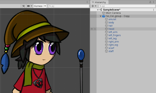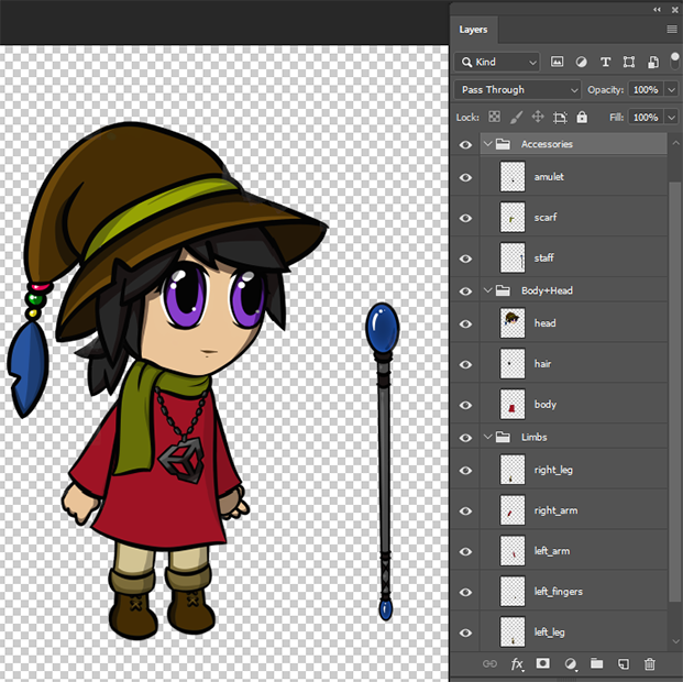 Refer to the following examples of a character designed in Photoshop and how its original layer hierarchy is transposed to the Prefab generated by the PSD Importer.