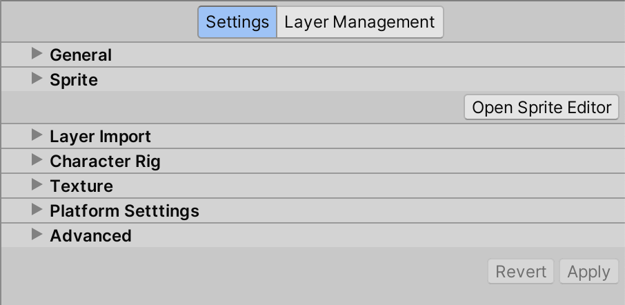 The Settings tab allows you to customize how the PSD Importer imports a file. The settings are categorized into individual section fold-outs.