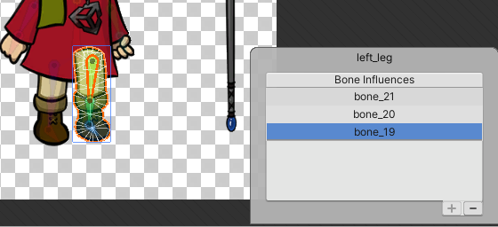 __Sprite Influence__ | Shift + M | Select which Sprites are being influenced by a bone. | ### Weights panel ![](images/Weights_panel.png) The Weights panel appears at the lower-right of the Sprite Editor window when __Auto Weights__ under the Weight tools is selected. | __Property__ | __Function__ | | ------------------------- | ------------------------------------------------------------ | | __Associate Bones__ | Select this box to automatically associate bones to the Sprite geometry they overlay. | | __Generate/Generate All__ | Select this button to generate weights for the currently selected Sprite, or for all Sprites if no Sprite is selected. This does not do anything if [geometry has not been generated](#geometry-tools) for the Sprites, or if no bones are associated with the Sprite geometry. | | __Normalize__ | Normalizes the weights of the selected Sprite, or all Sprites if no specific Sprite is selected. | | __Clear__ | Clear the weights of the selected Sprite, or of all Sprites if no specific Sprite is selected. | ### Weight Slider ![](images/WeightSlider.png) | __Property__ | __Function__ | | ------------------------------------------- | ------------------------------------------------------------ | | __Mode__ | The current behavior of the __Weight Slider__ tool. | |     Add and Subtract | Select this mode to have all sliders influence all vertices around the selected bone (currently displayed in the **Bone** property). | |     Grow and Shrink | Select this mode to have all sliders influence only vertices that are already affected by the selected bone (which is selected in the **Bone** property). | |     Smooth | Averages the weights of all vertices with their neighbors to create an even distribution of weight across all vertices. | | __Bone__ (unavailable if __Mode > Smooth__) | Displays the currently selected bone. Use the drop-down menu to select a different bone, or select another bone. | | __Normalize__ | Select this to ensure the total normalized weight of all vertices of a selected Sprite mesh is equal to one. | | __Amount__ | Amount of weight applied on selected vertices. | | __Vertex Weight__ | Adjust the bone weights of selected vertices. | ### Weight Brush ![](images/WeightBrush.png) | __Property__ | __Function__ | | ---------------------------------------- | ------------------------------------------------------------ | | __Mode__ | The current behavior mode of the weights tool. | |     Add and Subtract | Select this mode to have all sliders influence all vertices around the selected bone. | |     Grow and Shrink | Select this mode to have all sliders influence only vertices that are already affected by the selected bone. | |     Smooth | Averages the weights of vertices with their neighbors to create a smoother distribution of weights. | | __Bone__ | The bone that the Brush is painting influence for. Select a different bone via the drop-down menu. | | __Normalize__ | Enable to ensure the normalized weight of painted vertices will equal to 1. | | __Size__ | Size of the weight brush cursor. | | __Hardness__ | Amount of weight applied by the brush per brushstroke. Higher values increase the weight per brushstroke, up to the maximum of 100 where the full weight is applied at once. | | __Step__ | Number of increments needed to apply the full weight of brush. | ### Bone Influences panel The __Bone Influences panel__ displays a list of bones that are currently influencing the selected Sprite Mesh. ![](images/BoneInfluencesExample.png) When the Skinning Editor is set to [Character mode](#editor-toolbar), the Bone Influences panel allows you to add a bone to the list which includes its influence in the deformation of the selected Sprite’s mesh, or remove a bone from the list which removes its influence instead. To add a bone to the list, select the bone in the __Skinning Editor__ window and then select __Add (+)__ at the bottom-right of the panel. To remove a bone from the list, select the bone in the list or in the editor window and then select __Remove (-)__. #### Rearranging bone order You can rearrange the bone order in the Bone Influences panel by selecting and the dragging the respective bone entries up or down the list. ![](images/BoneInfluences_order.png) The order of the bones in the Bone Influences panel determines the order of the bones on the __Sprite Skin__ component. This is especially important when replacing the Sprite for deformation in the __Sprite Renderer__, such as when using [Sprite Swap](SpriteSwapIntro.md), as you can ensure the bone order remains the same between the Sprites and that the correct Transform drives the correct deformation. ![](images/BoneInfluences_orderSpriteSkin.png) ### Sprite Influences panel The __Sprite Influences panel__ displays a list of Sprite Meshes that are currently being influenced by the selected bone. ![](images/SpriteInfluencesExample.png) When the __Skinning Editor__ is set to [Character mode](#editor-toolbar), the Sprite Influences panel allows you to remove an unwanted Sprite Mesh from the list so that it’s not influenced by the selected bone. It’s also possible to add a selected Sprite to the list which will include the selected bone’s influence in its deformation. To add a Sprite Mesh to the list, select the bone in the Skinning Editor window as well as the Sprite you want to add, and then select __Add (+)__ at the bottom-right of the panel. To remove a Sprite from the list, select it in the list or in the editor window and then select __Remove (-)__. ## Rig tools The __Rig tools__ contain the option to __Copy__ and __Paste__ bones from and into a skeleton rig. | __Tool__ | __Default Shortcut__ | __Function__ | | ------------------------------------------------------------ | -------------------- | ------------------------------------------------------------ | | ![Copy](images/icon_Copy.png)