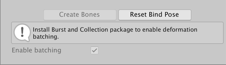 Sprite Skin component settings. Property | Function --------------------|----------------------------------------------------------------------------------------------------------------------------------------------------------------------------------------------------------------------------------------------------------------------------------------------------------------------------------------------------- **Always Update** | Enable this to have the Sprite Skin continue to deform the Sprite even when the visual is not in the view of the Camera. **[Auto Rebind](#auto-rebind)** | Enable this to have the component attempt to find the correct GameObject Transforms to use as bones for the Sprite by using the GameObject Transform set in the **Root Bone** property as the starting point. **Root Bone** | Use this property to indicate which GameObject Transform will be used as the Root Bone for the Sprite. **Bones** | This shows the list of bones that are being setup for the Sprite in the Skinning Editor module. For each Sprite’s **Bone** entry, there needs to be a GameObject Transform associated with it so that deformation can be done correctly. **Create Bones** | The button allows users to create GameObject Transform(s) to represent the Sprite’s Bone and assign them to the **Root Bone** property and the individual Bones entry. The Root Bone that will be created will be placed as a child of the GameObject of the Sprite Skin. The button will only be enabled if the Root Bone property is not assigned. **Reset Bind Pose** | The button resets the GameObject Transforms assigned in the Bones entry to the bind pose value setup for the Sprite in the Skinning Editor module. **Enable Batching** | When this is enabled, the deformation of the Sprite by Sprite Skin will be done in batches for [optimization purposes](#optional-performance-boost). This option is only available when the Burst and Collections packages are installed. If either of them are missing, the checkbox will be disabled and following information will be shown in the inspector. - |![](images/2D-optional-perf-boost-disabled.png) ## Auto Rebind When you enable **Auto Rebind**, Sprite Skin will attempt to automatically locate the GameObject Transform that is needed for the current Sprite assigned to the Sprite Renderer. This is triggered when the Sprite in the Sprite Renderer property is changed. When a rebind is required, the Sprite Skin will look for the GameObject Transform name that matches the bone name in the Skinning Editor module. ![](images/2d-anim-auto-rebind-example.png)