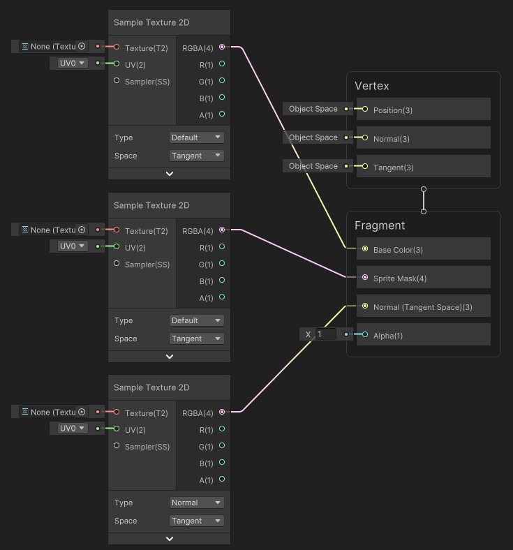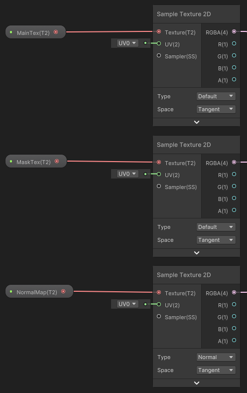 7. Drag each of the **Texture 2D** properties onto the editor window. Attach each of the properties to the **Input Slots** of the Sample Texture 2D Nodes as shown below. Note that the 'NormalMap' property must be attached to the **Normal Type** Node only.