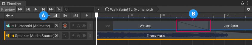 Blend two clips on the same track to create a smooth transition between two Animation clips, two Audio clips, or two Playable clips. To blend two clips, select the Mix Edit mode and position or trim one clip until it overlaps an adjacent clip.