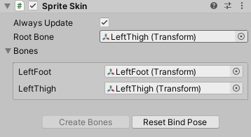 The order of the bones in the Bone Influences panel determines the order of the bones on the Sprite Skin component. This is especially important when replacing the Sprite for deformation in the Sprite Renderer, such as when using Sprite Swap, as you can ensure the bone order remains the same between the Sprites and that the correct Transform drives the correct deformation.