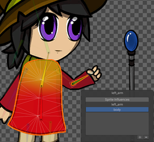 When the Skinning Editor is set to Character mode, the Sprite Influences panel allows you to remove an unwanted Sprite Mesh from the list so that its not influenced by the selected bone. Its also possible to add a selected Sprite to the list which will include the selected bones influence in its deformation.