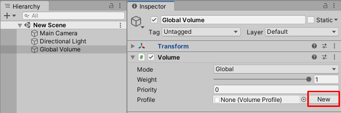 Select the Global Volume GameObject. In the Volume component, create a new Profile by clicking New button on the right side of the Profile property.