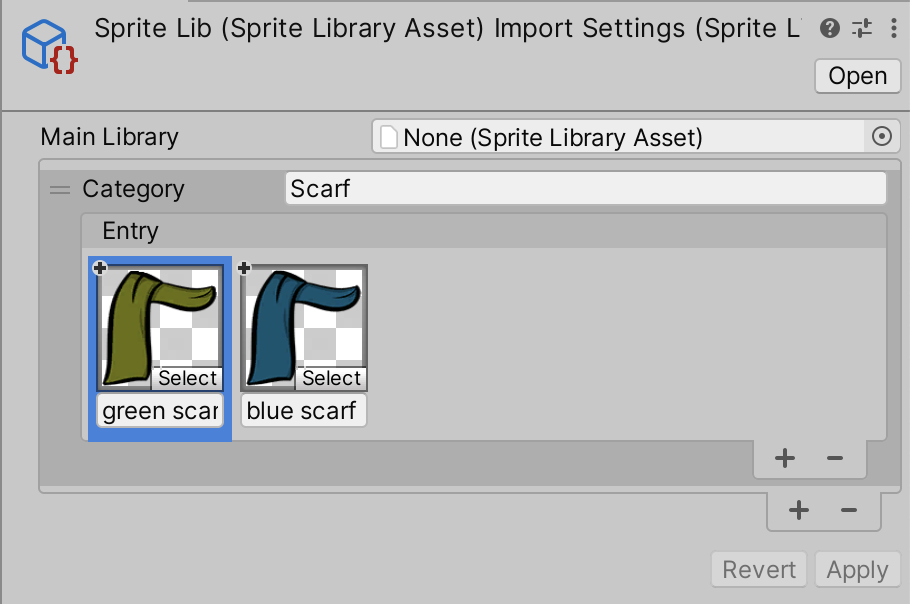 1. Place the Sprites for both scarves into the same Sprite Library Asset, and add them both to the same Category (named Scarf).