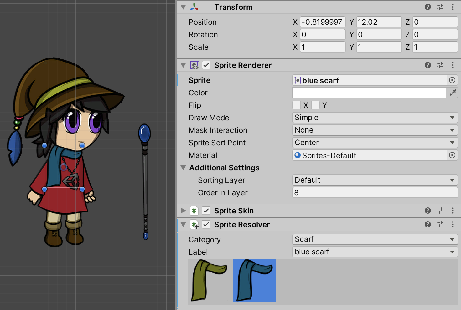 The Sprite Resolver's Label is set to blue scarf.
