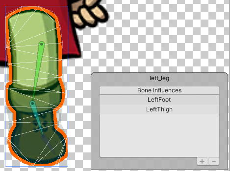 When the Skinning Editor is set to Character mode, the Bone Influences panel allows you to add a bone to the list which includes its influence in the deformation of the selected Sprite’s mesh, or remove a bone from the list which removes its influence instead.