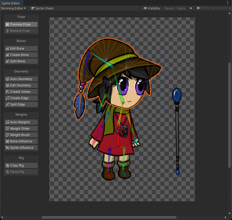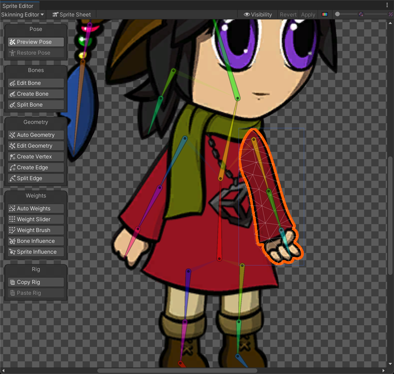 The Skinning Editor is a module which is added to the Sprite Editor after installing the 2D Animation package. Use the editor's tools to create the bones of your actor's skeleton, generate and edit its mesh geometry, and adjust the weights that bind the bones to the meshes as you rig your actor.