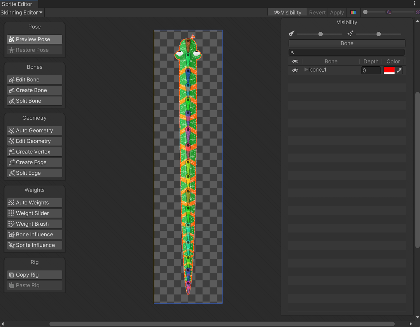 5. Add the Sprite Skin component to the 'Boris' GameObject, and go to the component's Inspector window. Select Create Bones to create GameObject Transforms which represent the bones of this Sprite.