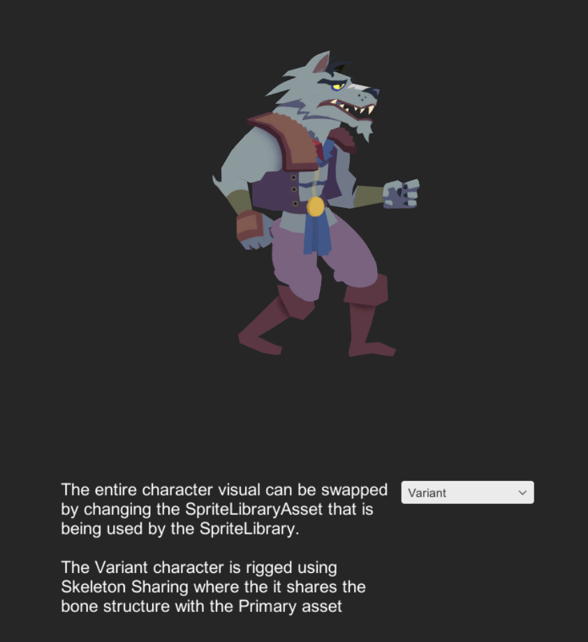 The Variant actor also uses the following Sprite Library Assets located in Assets/Samples/2D Animation/[X.Y.Z]/Samples/5 SpriteSwap/Sprites: