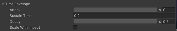 Scale With Impact Enable this to apply signal amplitude scaling to Time Envelope. If checked, the Cinemachine Impulse Source component scales the time envelope according to the strength of the impact: stronger impacts last longer, and milder impacts have a shorter duration.