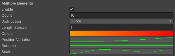 | Distribution | Select the method that Unity uses to generate multiple lens flare elements: •Uniform •Curve •Random |