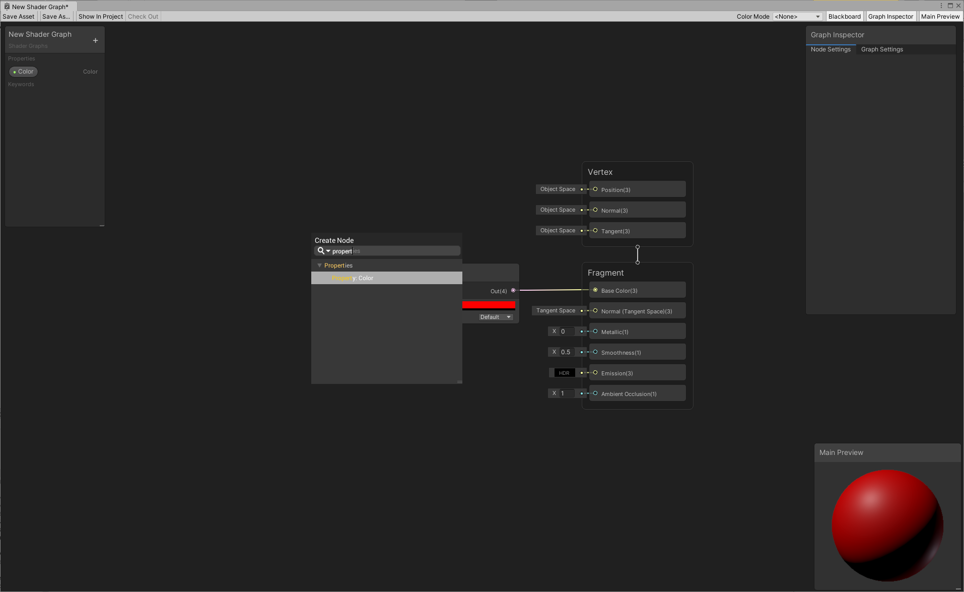 You can also use properties to alter your shader's appearance. Properties are options that are visible from the Material's Inspector, which lets others change settings in your shader without the need to open the Shader Graph.