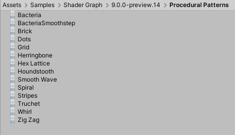 Unity places imported samples in your Project's Asset folder under Assets > Samples > Shader Graph > [version number] > [sample name]. The example below shows the samples for Procedural Patterns.