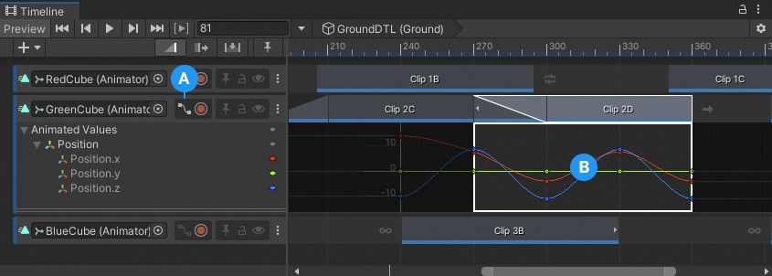 Use the Curves view to view and edit animation curves for audio tracks, infinite clips, and animation clips. The Curves view is similar to Curves mode in the Animation window.