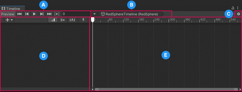 The Timeline window provides dedicated areas for controlling playback, selecting a Timeline instance, setting Timeline options, managing tracks, adding markers, and managing clips.