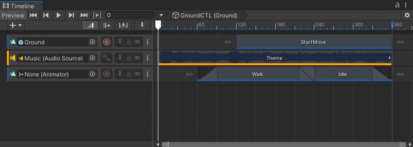 The Timeline window switches to the Sub-Timeline instance, indicated by the Timeline title which is the name and GameObject of the parent Timeline instance, followed by the name and GameObject of the Sub-Timeline instance.