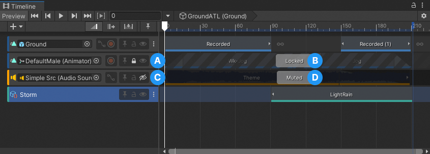 For example, you can lock an Animation track when you have finished creating a cut-scene and you want to avoid inadvertently modifying its Animation clips. You can mute an Audio track if you want to stop its audio from playing while you edit other tracks and clips in your Timeline instance.