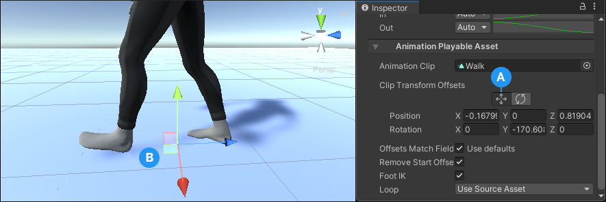 Walk) matches the position and rotation of the humanoid at the end of the first Animation clip.The ghosted